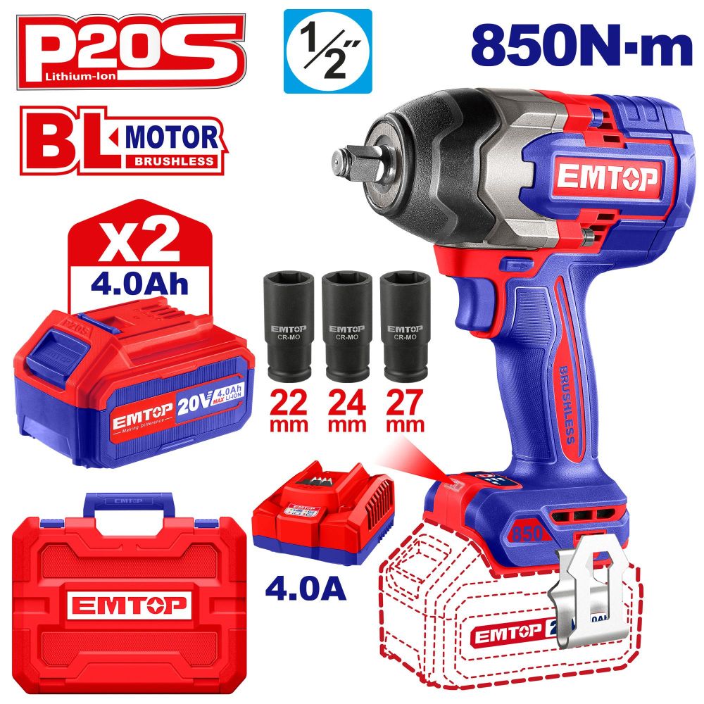 Akumulatorski udarni odvijač ECIWL2085 Emtop sa 2 4 Ah litijumske baterije i motorom bez četkica. Ima obrtni moment od 850 Nm pri zavrtanju i 1000 Nm pri odvrtanju, LED radno svetlo i kao dodatak 3 nasadna ključa (22,24,27mm). Dolazi sa koferom za skladištenje i transport.