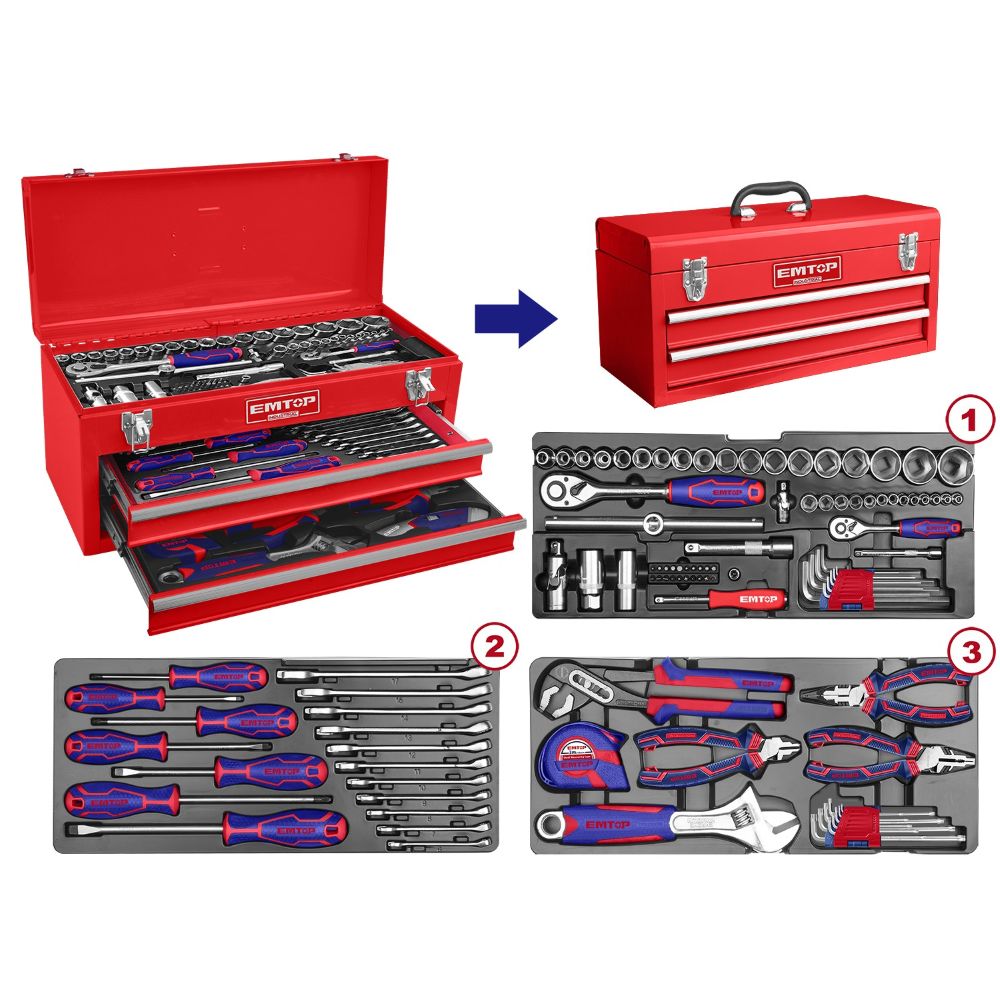Set od 105 Emtop ručnih alata spakovanih u metalnu kutiju za alat.