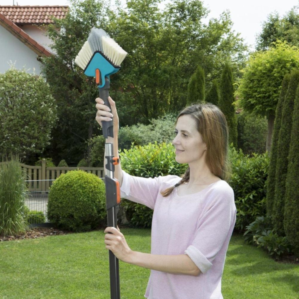 Со аголната метла GARDENA combisystem (3634-20), можете оптимално да исчистите агли, на пример, за да отстраните пајажини. Благодарение на заменливите додатоци, GARDENA combisystem овозможува флексибилна употреба во градинарството. Метлата е компатибилна со сите рачки од GARDENA combisystem и може да се вметне и навртува во соодветната рачка. За удобна работа на висина до пет метри, GARDENA препорачува употреба на метлата во комбинација со телескопската рачка combisystem (артикал бр. 3721-20). Безбедната врска помеѓу аголната метла и рачката гарантира работа без нишање и сигурна работа во секое време. Благодарение на интегрираната рачка, можете удобно да ја користите метлата и без рачката combisystem. Висококвалитетните влакна и издржливото пластично куќиште обезбедуваат идеални резултати од чистењето и долготрајна употреба. Аголната метла импресионира со својот компактен, тенок дизајн, а аголот на работа можете индивидуално да го прилагодите со помош на брзото откопчување. Ова ви овозможува да ги достигнете сите агли.