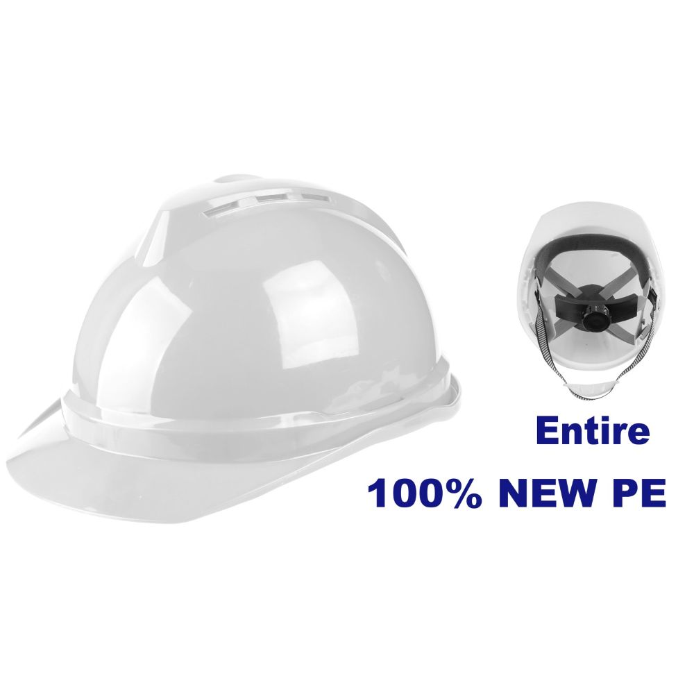 Заштитна кацига со HDPE со отвори за вентилација. Обложена со лента, вклучена лента за брадата, горно засилување од типот „V“, суспензија со 4 точки, прилагодување на големината на главата со копче.