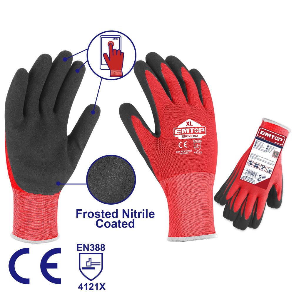 Ракавици обложени со нитрил, погодни за индустриска употреба. Материјал: Основна ткаенина / Нитрилен слој.