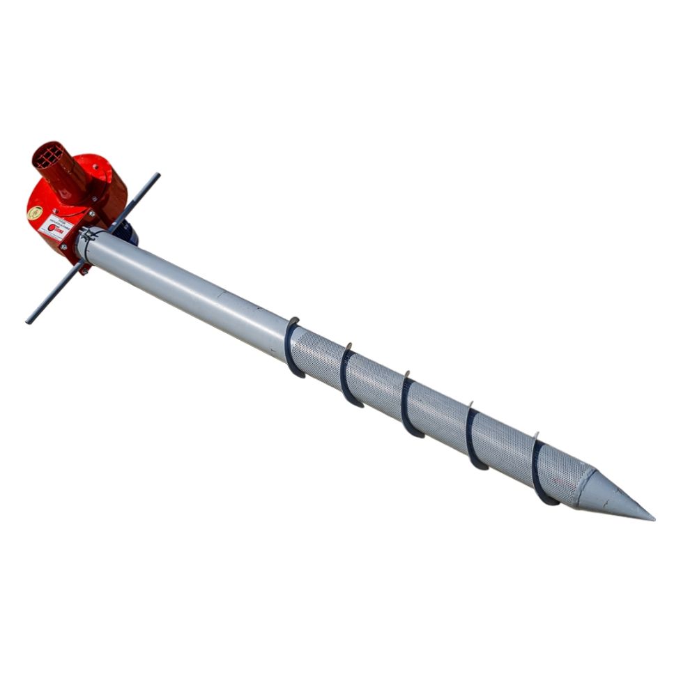 Тајфун за проветрување на житни култури со моќност на моторот од 1.1 kW. Тајфунот може да дува или всисува воздух во радиус од 4 m и длабочина до 2,5 m.