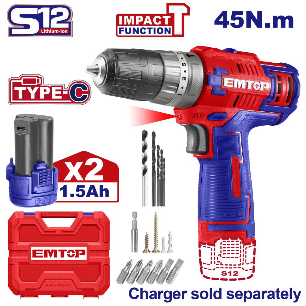 Батериска дупчалка ECDL12620 Emtop со 2 литиумски батерии од 12 V, 1,5 Ah со две механички работни брзини. Има LED работно светло, LED индикатор за статус на батеријата и како дополнителна опрема 50 парчиња додатоци како што се дупчалки, додатоци, адаптер, завртки. Производот доаѓа со кутија за складирање и транспорт. *Предупредување. Полначот за батерии се продава одделно (USB C-тип).