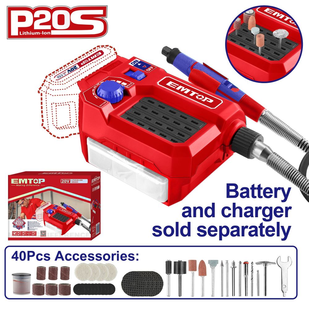 батериска брусилка Emtop ELMG2001 која може да ги користи сите 20V литиумски батерии од Emtop. Покрај тоа, доаѓа со сет од 40 додатоци. *Забелешка: Машината е без батерии и полнач. Компатибилна е со сите 20 V (P20S) батерии и полначи од Emtop.