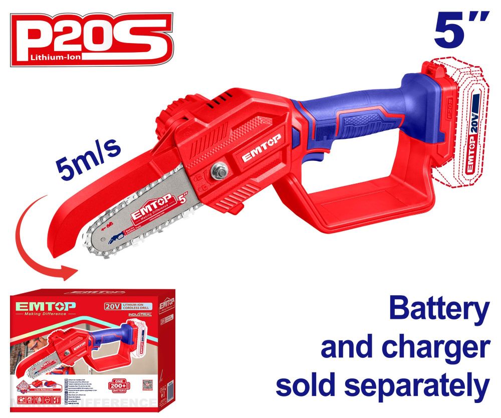 Батериска пила со меч од 5″ (13 см). Комплетот вклучува пила и ланец, кутија за масло и клуч (алатка). *Забелешка: Машината не вклучува батерија или полнач. Компатибилна е со сите 20 V (P20S) Emtop батерии и полначи.