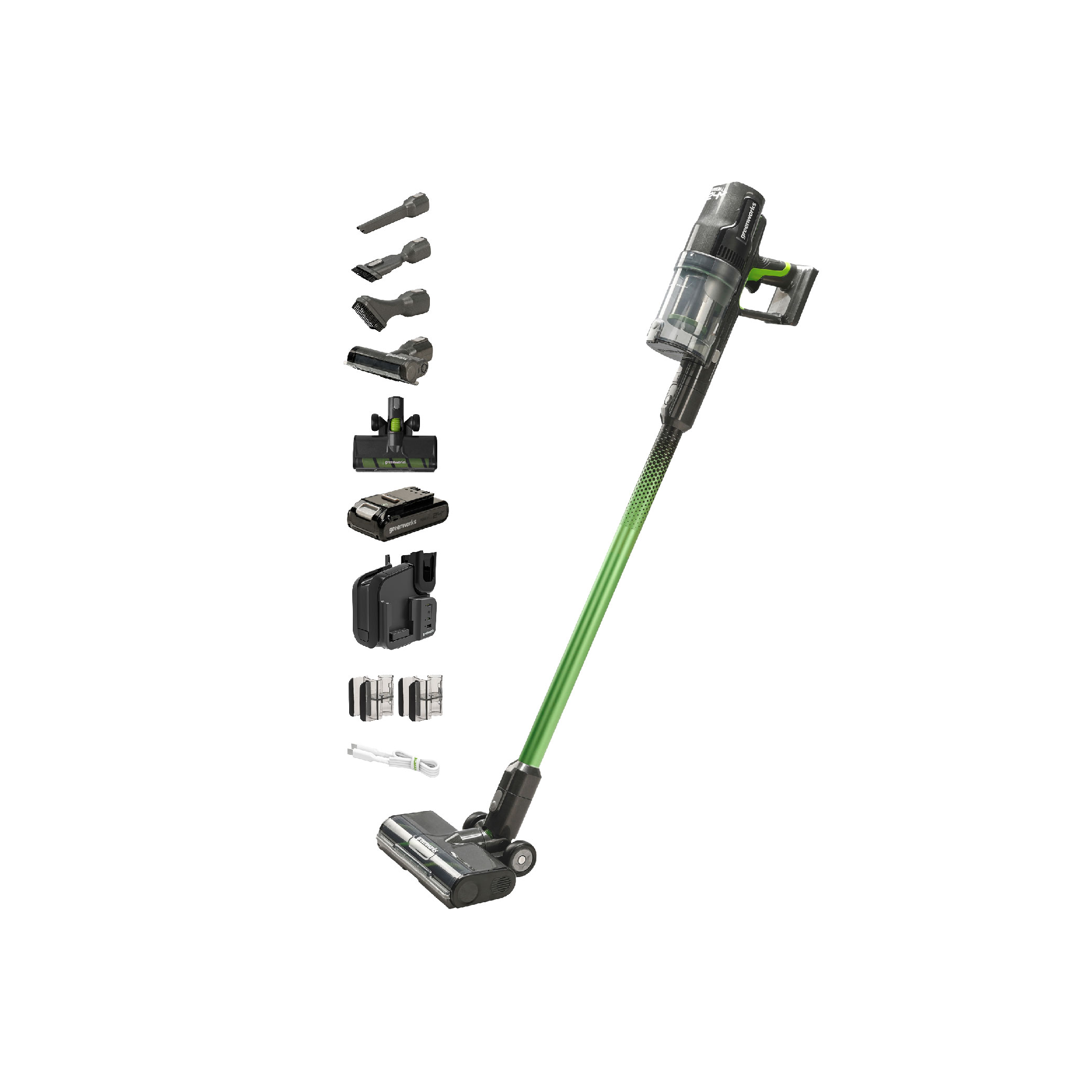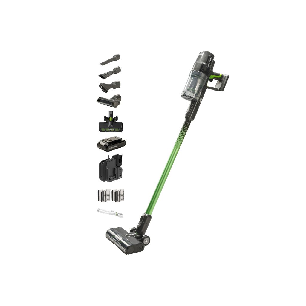 Врвна батериска правосмукалка со моќен мотор без четкички, напојуван од 24V батерија на Greenworks. Батерија е компатибилна со сите 24V алатки на Greenworks. Правосмукалката е опремена со лед светло, HEPA филтер со 99.97% филтрација и разновидни додатоци за да одговара на потребите на секое домаќинство.