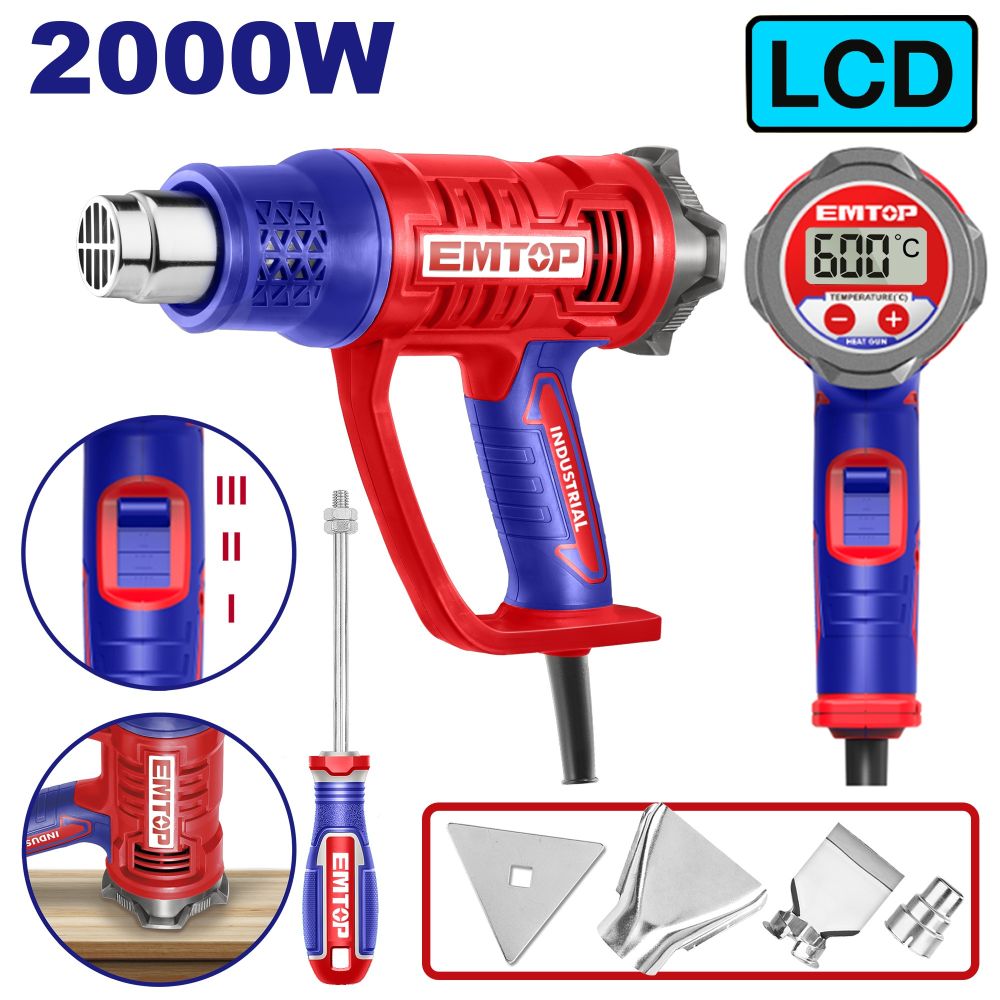 Fen za vrući vazduh Emtop EHGN20056 sa podesivom radnom temperaturom koja se prikazuje na LCD ekranu radi bolje kontrole. Ima 3 nivoa protoka vazduha i dolazi sa 3 dizne i strugačem.
