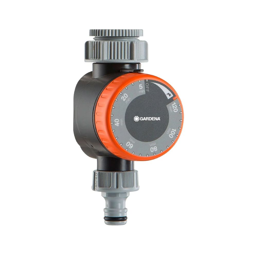 Дозволете автоматскиот рачен тајмер GARDENA да се грижи за наводнувањето во вашата градина. И поврзувањето и работењето се лесни и удобни. Најпрво го прикачувате рачниот тајмер на чешмата за вода. Сега поврзувате градинарско црево на неговиот излез, кој пак е поврзан со прскалка GARDENA, на пример. Со помош на вртливото копче можете флексибилно да го поставите времетраењето на наводнувањето помеѓу 5 и 120 минути. По истекот на времето, тајмерот автоматски го запира протокот на вода. Бидејќи тајмерот работи механички, не му треба батерија или напојување. Благодарение на функцијата за постојан проток, можете да продолжите да црпите вода без да го вадите уредот. Рачниот тајмер  е квалитетен производ направен во Германија. Контроли на вода: Целосно портфолио со иновативни карактеристики за автоматско наводнување на градината и заштеда на вода. Одговара за славини со навој од 26,5 mm (G 3/4) или 33,3 mm (G1) и има работен притисок од 0.5-12 bar.