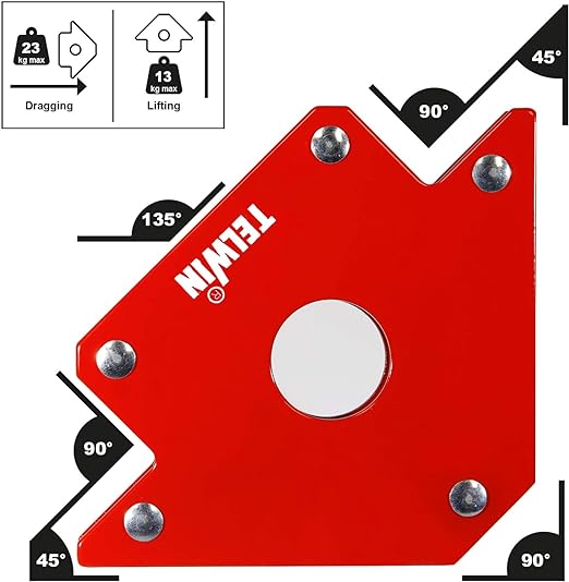 Магнетен позиционер за заварување. Одличен за држење на материјали за заварување за време на операциите на заварување. Овозможува материјалот да се подига под агол за одлично заварување со поставување на аглите на 45°, 90° и 135°. Моќниот магнет овозможува поместување на плочи и профили до 23 кг и кревање до 8 кг.