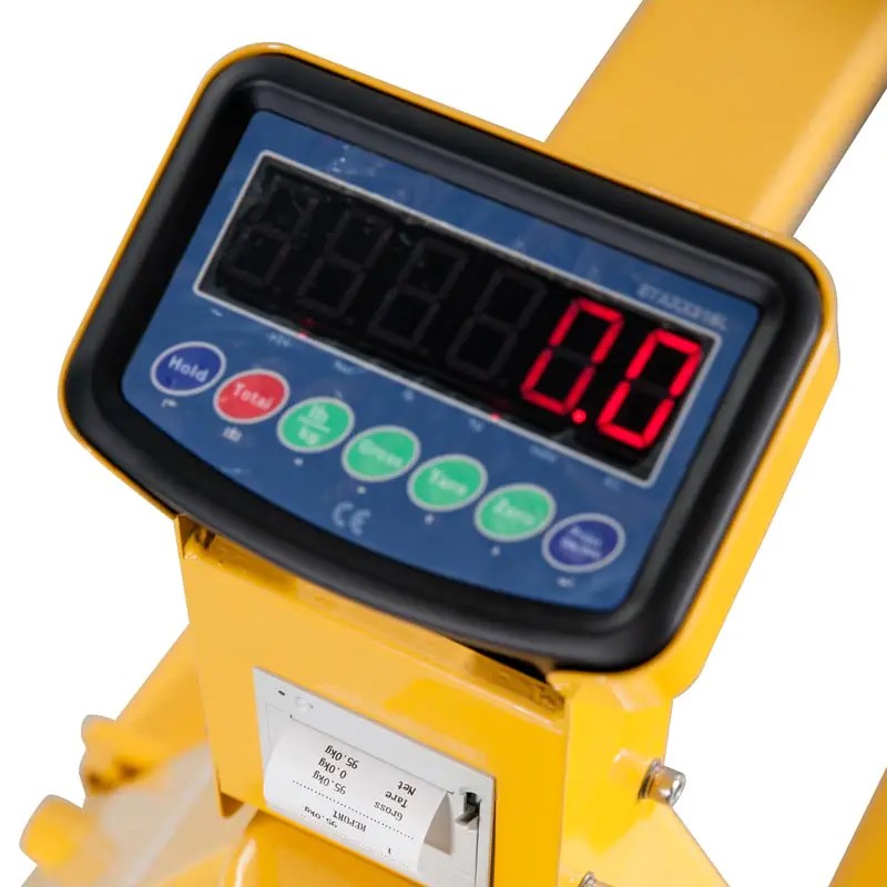 Палетен вилушкар за манипулација со стоки опремен со вага.
