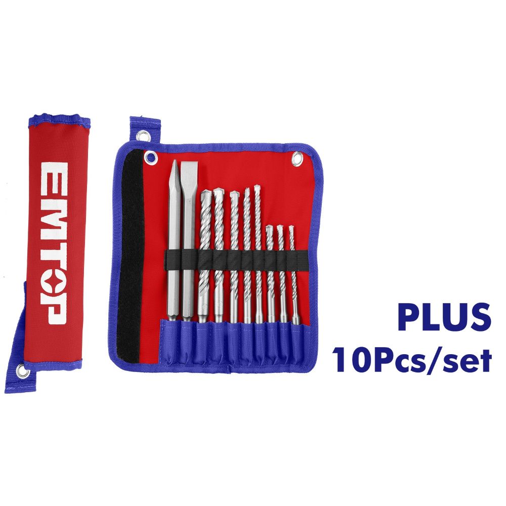 Komplet 8 komada SDS-Plus burgije: 6x160mm, 8x160mm, 10x160mm, 8x210mm, 10x210mm, 12x210mm, 14x210mm, 16x210mm 2 komada SDS-Plus dleta: 14x250mm, 14x250x20mm