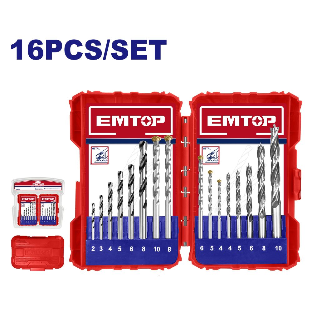EMTOP сет од 16 бургии за ѕид – 4, 5, 6, 8, 10 мм, за метал – 2, 3, 4, 5, 6, 8 мм, за дрво – 4, 5, 6, 8, 10 мм.