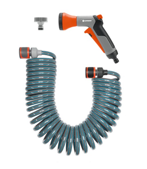 Сет црево со туш пиштол кој e практично решение за наводнување растенија на балкони, дворови или мали градини. По употреба, цревото автоматски се намотува до минимална големина. Ова ја елиминира потребата да се одвиткува и повторно да се навиткува цревото. Идеално е за наводнување на растенија на мали површини. Приложениот распрскувач за вода лежи добро во рака а количината на вода може да се прилагоди и по желба.