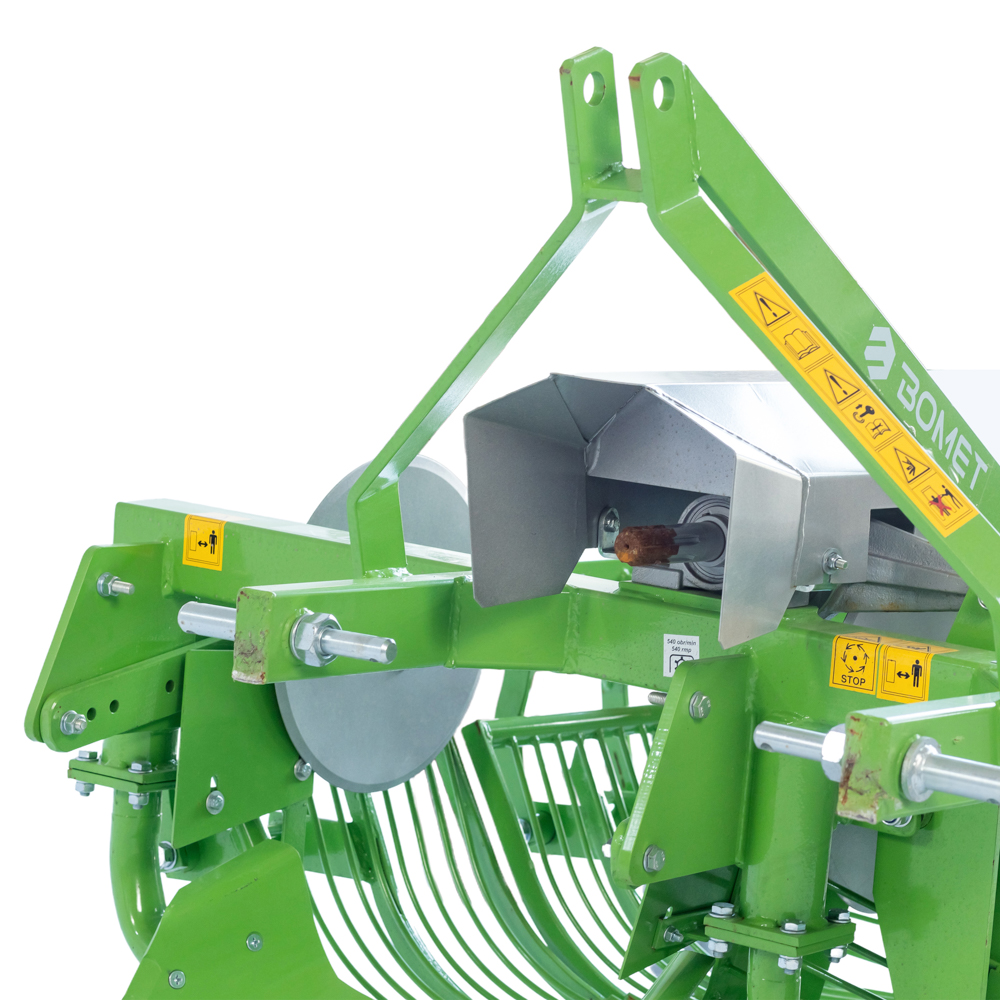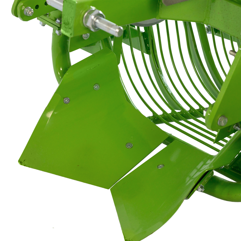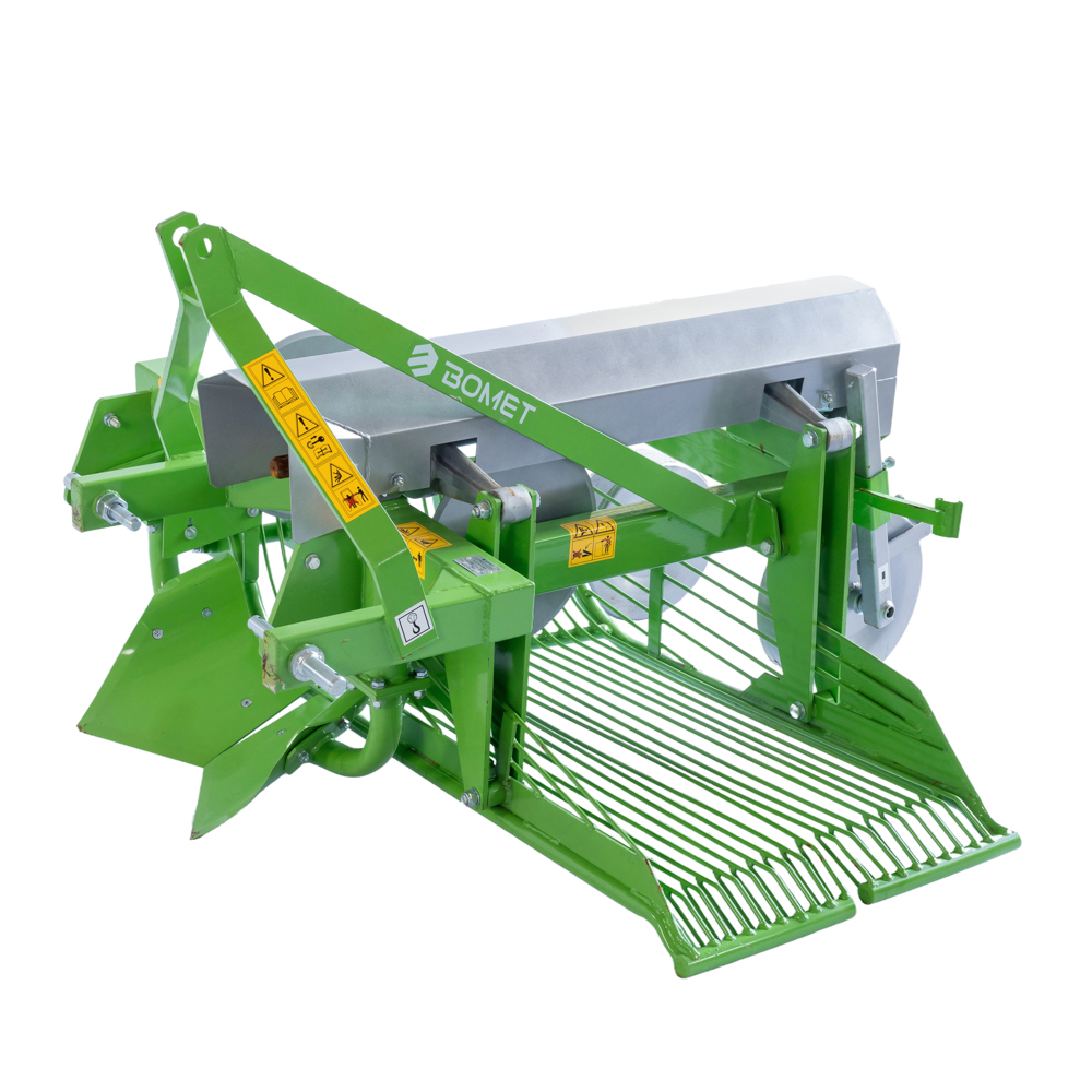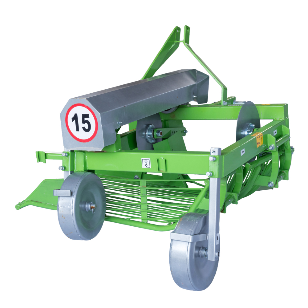 Машина монтирана на трактор со страничен исфрлувач што се користи за исфрлање компири од земјата. Машината има контрола на длабочината и користи вибрации за да ја тресе земјата и да ги фрла компирите настрана.