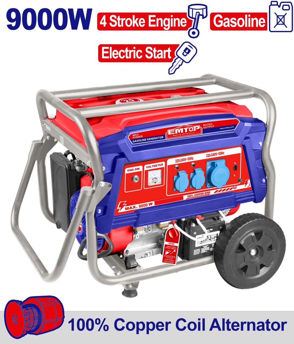 Monofazni benzinski agregat EGGRD9011 Emtop snage 9 kW, 4-taktnim OHV motorom, vazdušnim hlađenjem i bakarnim namotajem. Ima električni start i opremljen je ergonomskom centralnom ručkom i točkovima za lakši transport.
